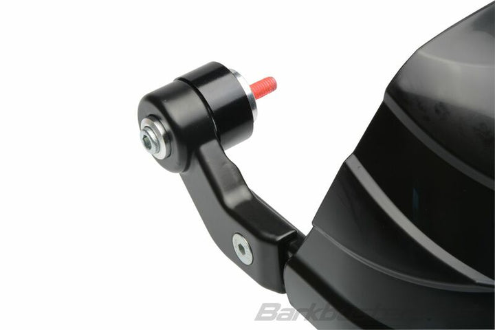 STORM Hanguard Kit Single Point Bar End Mount Threaded To fit 6mm or 8mm internal thread handlebar. Designed for weather protection only. NOT designed for impact protection. Mounted to a single point on the handlebar end using a unique internal locking system. Incorporates an aluminium frame and locking cap to secure the handguard in place. Provides excellent wind and cold weather protection. Easy installation. Black STORM plastic guard included. Note: some Triumph models have a 5mm internal thread which must be drilled and tapped to 6mm. Note: This Single Point Mount product is not designed for impact protection. (If impact protection is required, choose from our TWO POINT MOUNT options). Color: Black Shell type: Storm Universal Mounting kit: 1 point Use: Moto