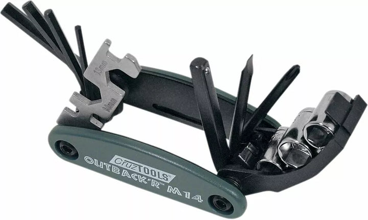 The Outback'r Multi-Tool is a must-sea for any metric motorcycle, Utv, ATV, PWC, or snowmobile, Enoughs to get you out of a jam, but not weigh you down, provides 14 tools in a 3.5 ”Package that Weighs, 3Sdludes, KITCES, KITCES, 13 & 14 mm Open Wrenches, 3 Sizes of Spoke Wrench, Slotted & Phillips Screwdrivers, 8, 10, 12 mm Sockets & 1/4 "Driver, Lifetime Guarantee - No Questions Asked