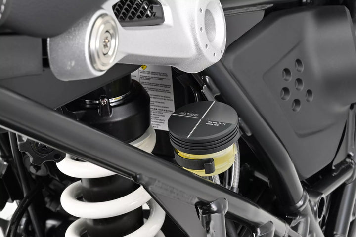 CNC-Machined Aluminum Master cylinder Tank of the rear Brake in Black and Gun-Metal Gray Double-Anodized, Used With The Oem Gasket / Diaphragm