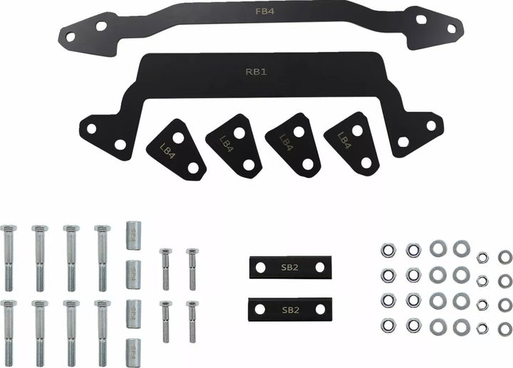 LIFTS ALL FOUR CORNERS OF THE VEHICLE FOR INCREASED BROUND CLEARANCE AND STRACHITY, DEGENINGS FOR MOUNTING LARGER TIRES, INCLUDES ALL NECESSARY HARDWARE AND INSTRUCTIONS