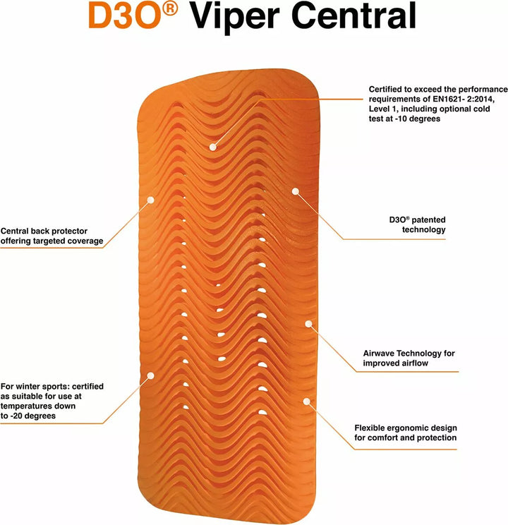 Extremely flexible, low profile and lightweight, Airwave Technology for Improved Airflow, for Winter Sports: Certified as suitable for use at temperatures down to -20 °, 13 mm thickness, back protector EN 1621-1: 2014 Level 1.