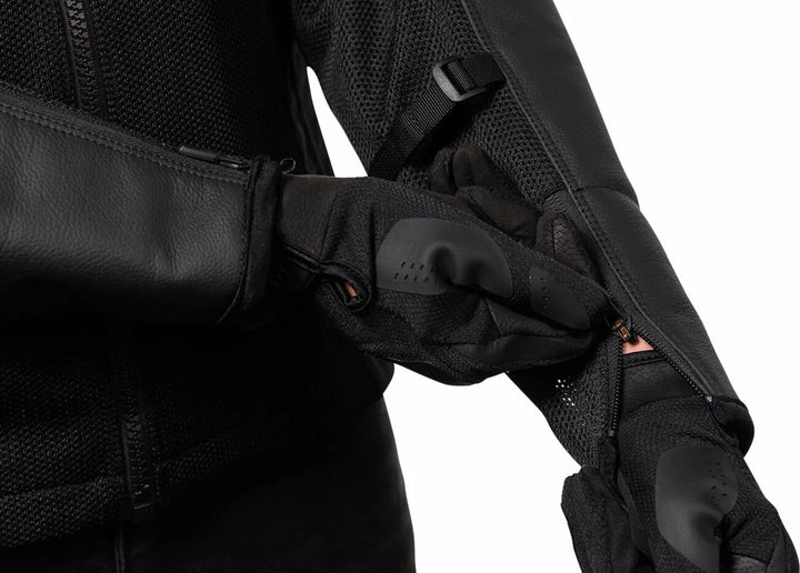 Durable 300D Polyester and Iron Weave ™ Mesh Chassis, 1.2 mm-1.4 mm Tracspec ™ Leather in Primary Crash Zone, Adjustable Waist and Arm Strap, ICon® Sport Fit, YKK® Zippers, Back Protector EN 1621-2 Level 1, EN170-70-2