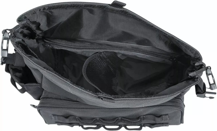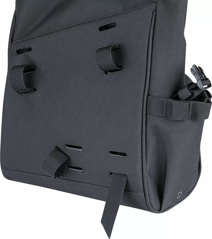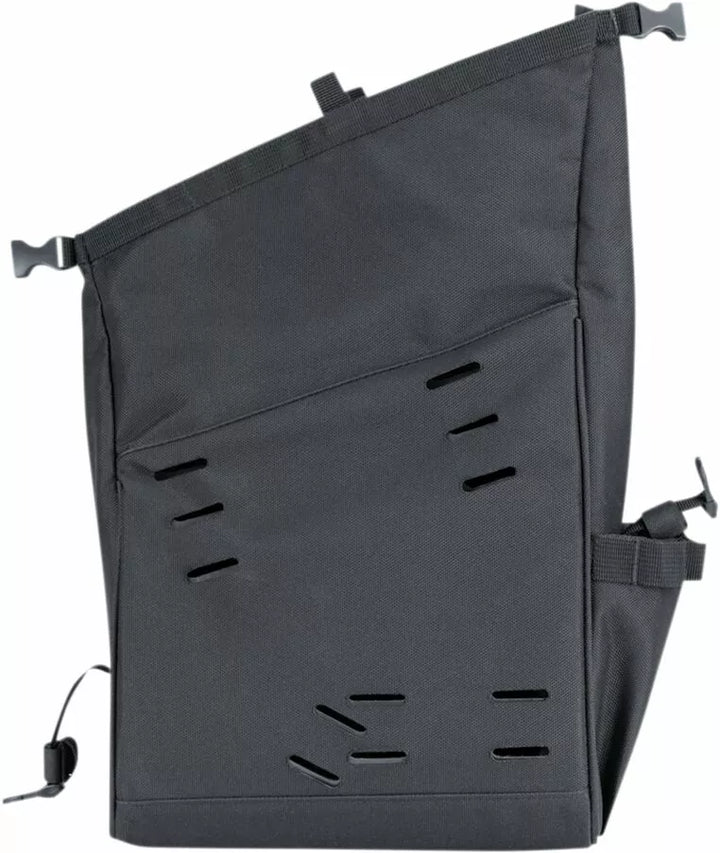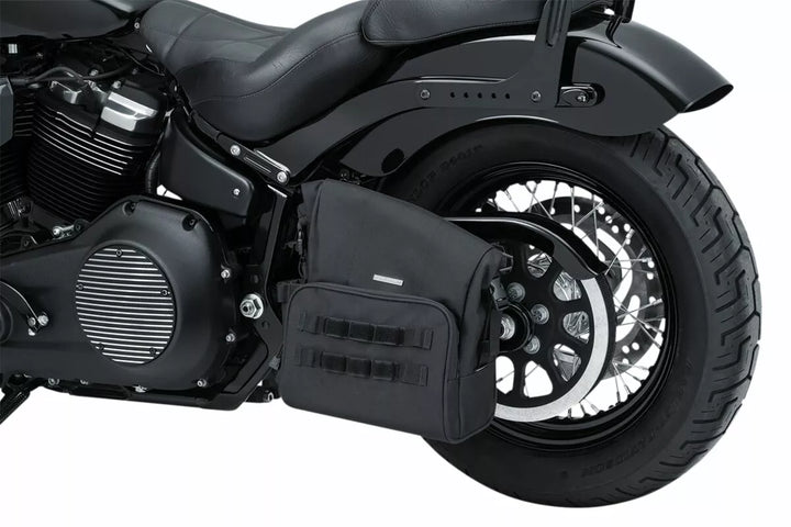 Secure roll-top design offers easy access while mounted, plus added protection from the elements, Made from UV-rated, weather-resistant 1200 denier textile, Interior liner keeps main storage free of debris and moisture, Rigid bottom-end design provides shape retention, durability and protection from the elements, Mounts to virtually any exposed triangle-style (Softail) Swing arm, Secure Safety-Focused Strap System Keeps Slap to Avoid Potential Belt/Chain Interference, External Zippered Compartment Plus Multiple Molle Molle Molle Molletm Cubic inches, EU: Measures 14.75 l