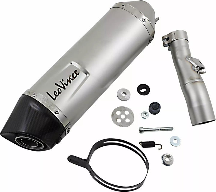 LV One Evo Stainless Steel is the synthesis between tradition and modernity., It combines the leovince classic style looks and innovation in the research of the most performing and lightweight materials., Features, aisi 304 stainless steel sleep, full carbon orb (1,650 ᄚ F), Adjustable Full Carbon Fastening Strap, Laser Etched Leovince Logo