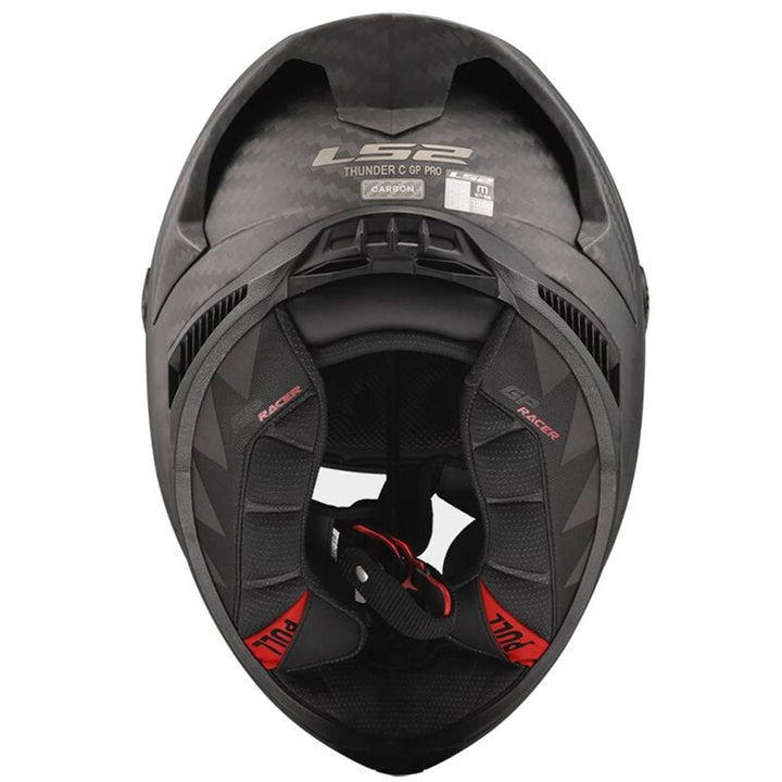 Insida av LS2 Integral Mc-Hjälm Carbon Thunder GP Pro med vadderad interiör och röd detalj för ökad komfort och säkerhet.