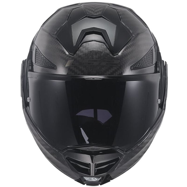 Framsida av LS2 Advant X Carbon svart mc-hjälm med tonat visir och modern design för optimal sikt och skydd.