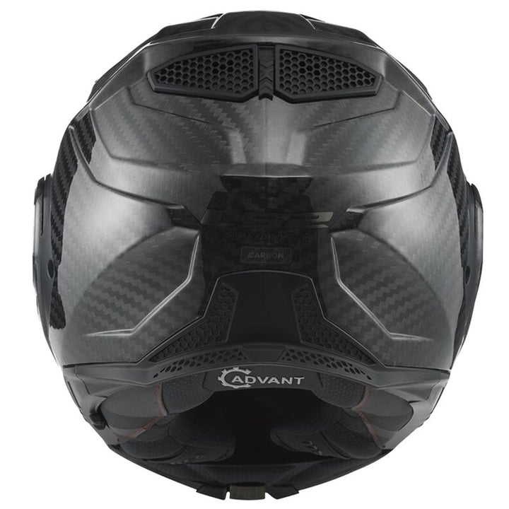 Baksida av LS2 Advant X Carbon svart mc-hjälm med ventilationssystem och kolfiberfinish för stil och funktionalitet.