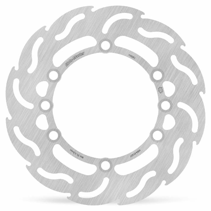 Flame Shaped Valenting Slots And Outer Perimeter Ensure An Equal Amount of Contact Surface Between The Brake Pad and Disc Throughout The Who Rotation of the Disc., Smooth and More Predictable BRAKING ACTION WHICH ALLOWS YOU TO BRAKE HARDER. Double-grinded for Perfect Fitment and Flatness, for Best Performance We Recommend Using Moto-Master Brake Pads with the Matching Pad Compound That Best Suits Your Type of Riding.