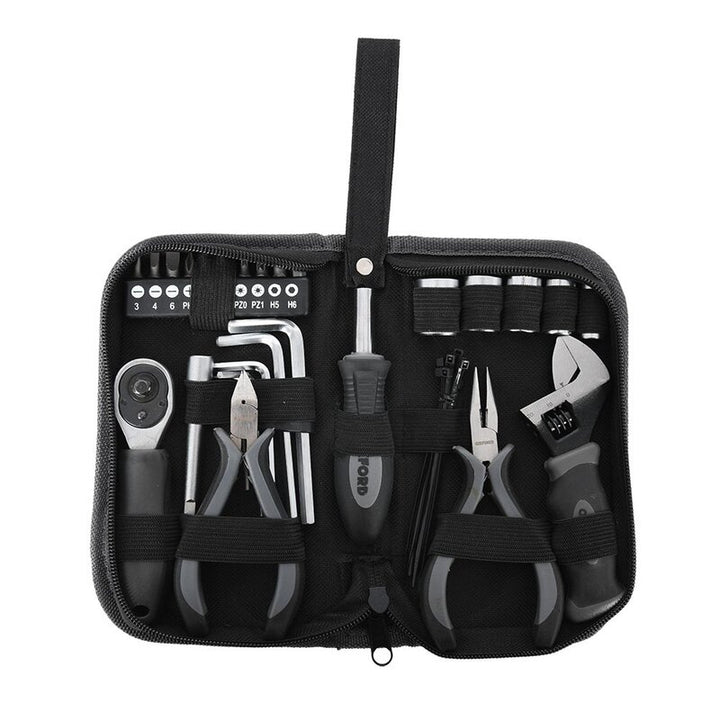 The Oxford Tool Kit Pro is a Comprehensive 27 Piece Premium Motorcycle Tool Kit. Soft Gel Handles Ensure The Tools Are Comfortable to Use and Each is Kept in Its Place By a Snug Fitting Elasticated Strap Inside a Compact Storage Case, Ideal to Keep under your Rear Seat. The Sockets, Extension Bar and Hex Keys are Made from Durable Chrome Vanadium Steel.