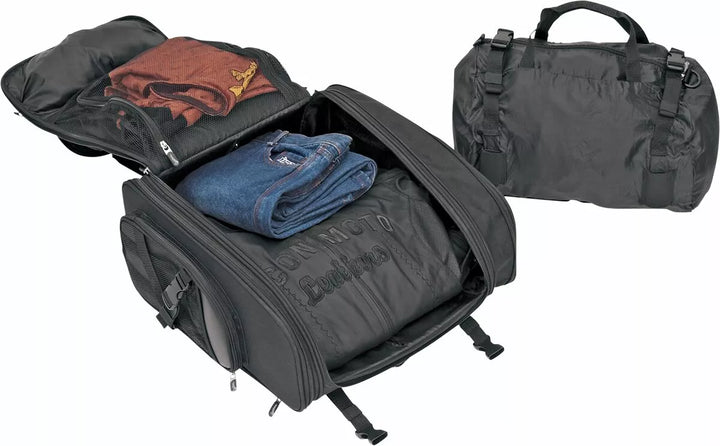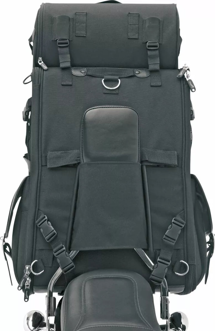 Conveniently Sized for Just About Any Trip; Expandable to Carry All Your Gear, Fully Adjustable Sissy Bar Mounting System Goes On In Seconds Over Any Size and Style Sissy Bar Pad; Once Adjusted for Your Size Pad, You Never Need To Adjust It Again, Rigid Construction Holds Bag Shape Even When Empty, Top Carry Handle, Backpack Straps and Shoulder Strap for Easy Toting Off Bike, FOOD DUW DUFF BAG INCLUDED FOR EXTRA CAPACITY; Attaches to s2200e's top cargo straps, which can also be used to tie down a jacket, rain, gear, etc., five weather resistant external pockets, top pocket office organizer and bull zipper puls, constructed of uv, water and wether- Dimensions: 18 "H X 15" W X 8 "D; Expands to 18½" W; Measures 2200 Cubic inches, EU Dimensions 45.72 cm Height x 38.1 cm Width x 20.32 cm Depth, Expands to 46.99 cm Width. , EU Capacity 36.05 l