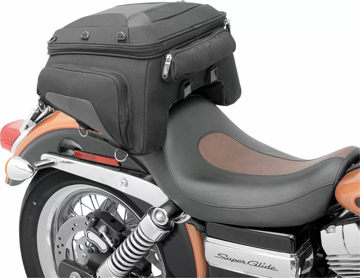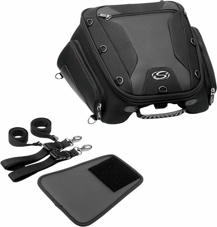 Fits Rear Seat/Pillions With Included Mounting System, Rugged 1200 Deniers Saddletuff ™ Construction For Long Life, Large Main Compartment Spacious Enough for Laptop or Notebook Computer, Three Internal Pockets and Three Big Exterior Pockets Easy Allows Easy Access Expand an Additional 2 "For Extra Storage, Water-Resistant Construction with Integrated Rain Cover, Thirteen Exterior D-Rings for Attaching Other Items Like Jacket or Other Luggage (Six Conceled D-Rings to Prevent Scratching), TECH Organizer for Smartphones, Clamshell Straps Can Be Opened A Full 180 °, Comfortable Carry Handle Allows The Bag To Be Used As A Suitcase When Off The Bike, Semi-Wrong Construction Holds Shape and Looks Great Even When Empty, including Area, The Bags Can Be Removed and Re-Atached Within Seconds Using A Series of Cam Locks On The Outside of the Bag