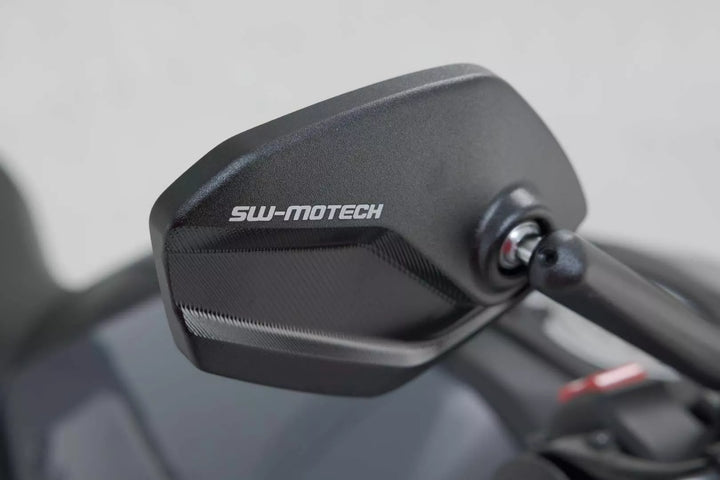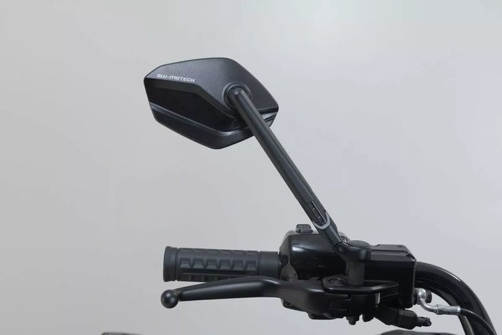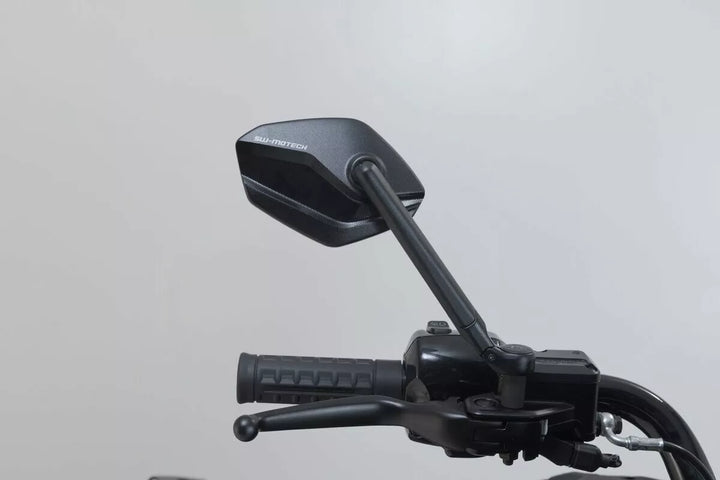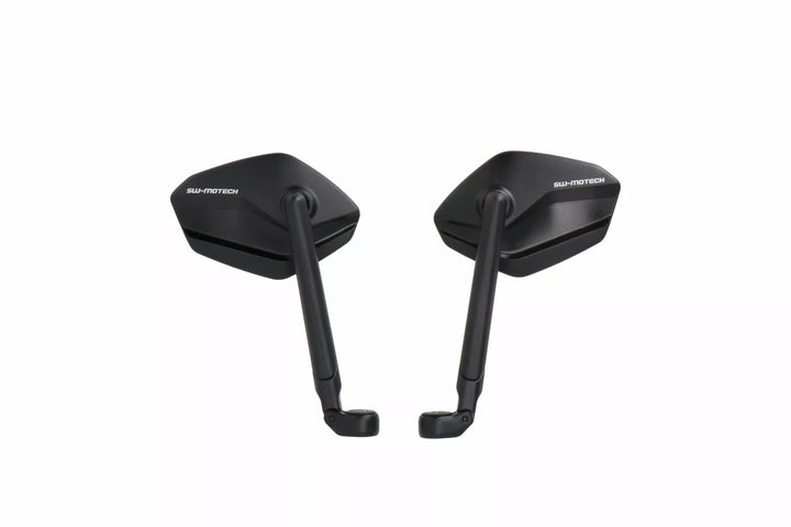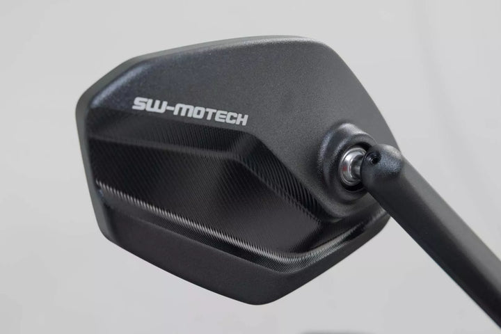 SW-Motech Manufactures The Adjustable Mirrors In A Modern and Flat Design From High-Quality Forged and Black Anodised Aluminum. , The Mirror Arms Consist of Continuously Adjustable Elements and Can Each Be Extended by 30 Millimetres. This Allows the Height and Length of the Mirrors to Be Adjusted to the Requirements of the Respective Pilot., This Sport Mirror Set Has a Short Mirror Arm. Mirror Arm Length: 152 mm., Modern and Flat Edge Design., Partial Areas and Functional Surfaces milled., 4 Different Adjustment Possibens for Best Possible Alignment., Stepless Rotation and Includes of the Mirror Arm. Mounting on Existing Mirror Connection., Scope of Delivery: 1 x Mirror Set Sport, 1 x Mounting Material for Mirror Set & Mounting Instructions.