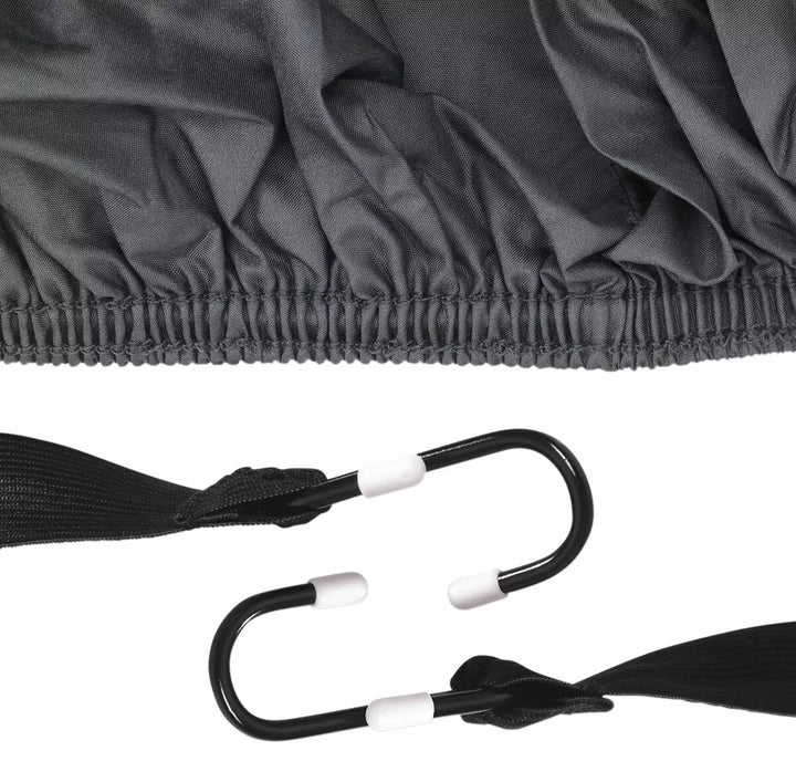 Made from Custom Dyed Water Resistant Polyurethane Coated Polyester, Providing Excellent Protection Against Weather, Dirt and Pollution., Durable Folded Interlocking Seams Provide The Best Durability and Weather Resistance. With 4 Elastic Straps with Hooks to Help Secure From Blowing Wind., Convenient Compact String String Storage Pouch., High Visibility Logo to Help Your Covered Ride Be Seen in Dark Parking Lots., LEFT AND RIGHT ATTENNA ACCESS POINTS WITH HOOK AND LOOP SEAL WITH HOOK AND LOOP SEAL WITH HOOK SEAL WITH HOOKS WITH