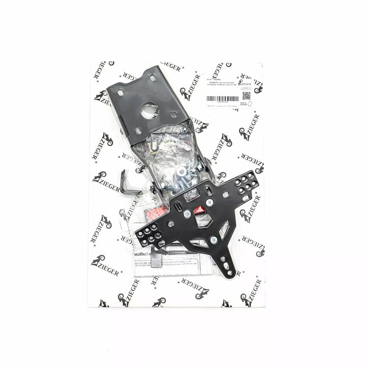 The License Plate Holder is Extremely Durable and Weather Proof., Black Powder Coated. , The License Plate Holder Can Be Used For Any Kind of License Plate (175mm Width)., No Modification of Fairing Required., Stepless Adjustment of Rake Angle., Indicator Support Adjustable in 3 Positions. Plate., Special Indicator Light Mounts (Sold Separately) Required for Stock Indicator Lights., Kit Includes: 1 License Plate Holder Incl. Mounting Kit., LED License Plate Light "e Approved" Incl. Support. Of: Switzerland, Poland and Ireland.