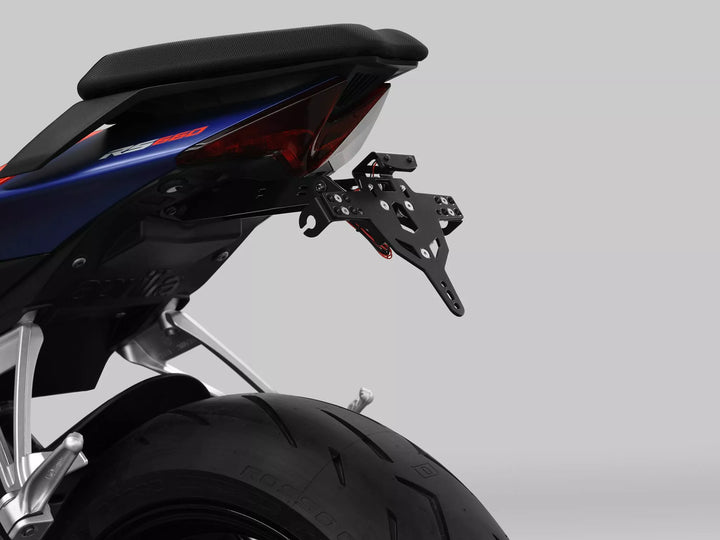 The License Plate Holder is Extremely Durable and Weather Proof., Black Powder Coated. , The License Plate Holder Can Be Used For Any Kind of License Plate (175mm Width)., No Modification of Fairing Required., Stepless Adjustment of Rake Angle., Indicator Support Adjustable in 3 Positions. Plate., Special Indicator Light Mounts (Sold Separately) Required for Stock Indicator Lights., Kit Includes: 1 License Plate Holder Incl. Mounting Kit., LED License Plate Light "e Approved" Incl. Support. Of: Switzerland, Poland and Ireland.