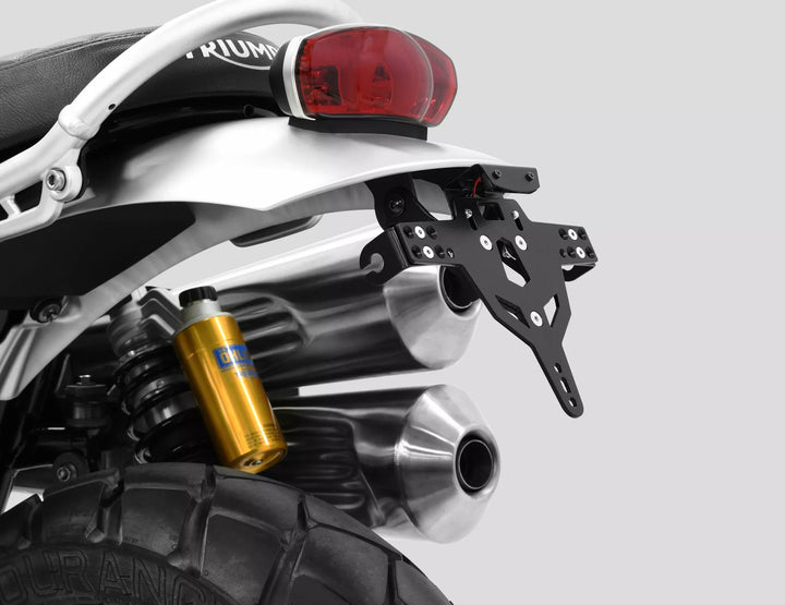The License Plate Holder is Extremely Durable and Weather Proof., Black Powder Coated. , The License Plate Holder Can Be Used For Any Kind of License Plate (175mm Width)., No Modification of Fairing Required., Stepless Adjustment of Rake Angle., Indicator Support Adjustable in 3 Positions. Plate., Special Indicator Light Mounts (Sold Separately) Required for Stock Indicator Lights., Kit Includes: 1 License Plate Holder Incl. Mounting Kit., LED License Plate Light "e Approved" Incl. Support. Of: Switzerland, Poland and Ireland.