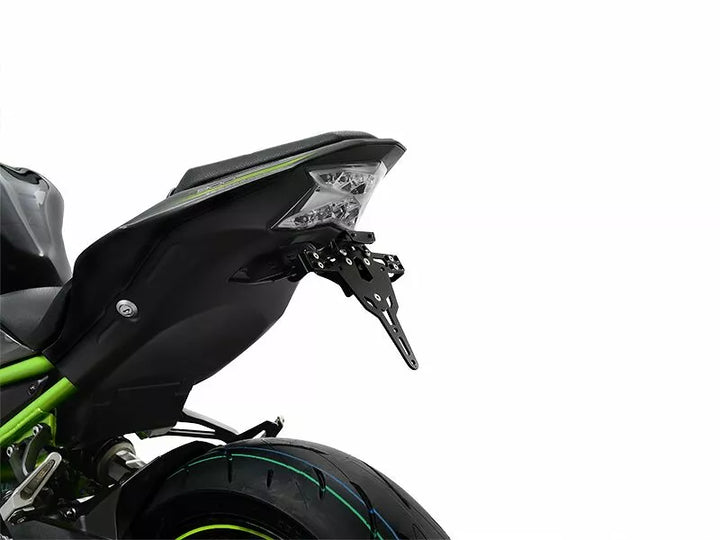The License Plate Holder is Extremely Durable and Weather Proof., Black Powder Coated. , The License Plate Holder Can Be Used For Any Kind of License Plate (175mm Width)., No Modification of Fairing Required., Stepless Adjustment of Rake Angle., Indicator Support Adjustable in 3 Positions. Plate., Special Indicator Light Mounts (Sold Separately) Required for Stock Indicator Lights., Kit Includes: 1 License Plate Holder Incl. Mounting Kit., LED License Plate Light "E Approsved" Incl. Support., Back Light With Support. Of: Switzerland, Poland and Ireland.