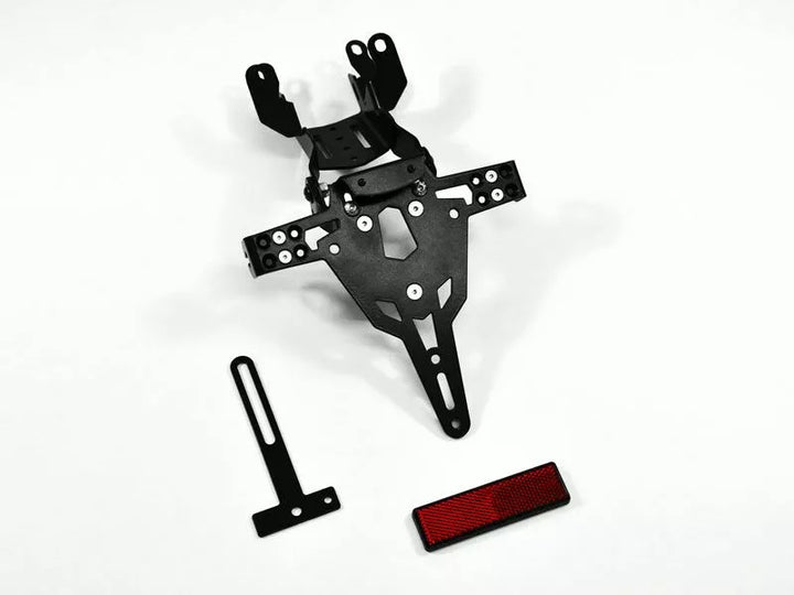 The License Plate Holder is Extremely Durable and Weather Proof., Black Powder Coated. , The License Plate Holder Can Be Used For Any Kind of License Plate (175mm Width)., No Modification of Fairing Required., Stepless Adjustment of Rake Angle., Indicator Support Adjustable in 3 Positions. Plate., Special Indicator Light Mounts (Sold Separately) Required for Stock Indicator Lights., Kit Includes: 1 License Plate Holder Incl. Mounting Kit., LED License Plate Light "e Approved" Incl. Support., Back Light With Support.