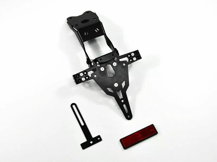 The License Plate Holder is Extremely Durable and Weather Proof., Black Powder Coated. , The License Plate Holder Can Be Used For Any Kind of License Plate (175mm Width)., No Modification of Fairing Required., Stepless Adjustment of Rake Angle., Indicator Support Adjustable in 3 Positions. Plate., Special Indicator Light Mounts (Sold Separately) Required for Stock Indicator Lights., Kit Includes: 1 License Plate Holder Incl. Mounting Kit., LED License Plate Light "e Approved" Incl. Support., Back Light With Support.