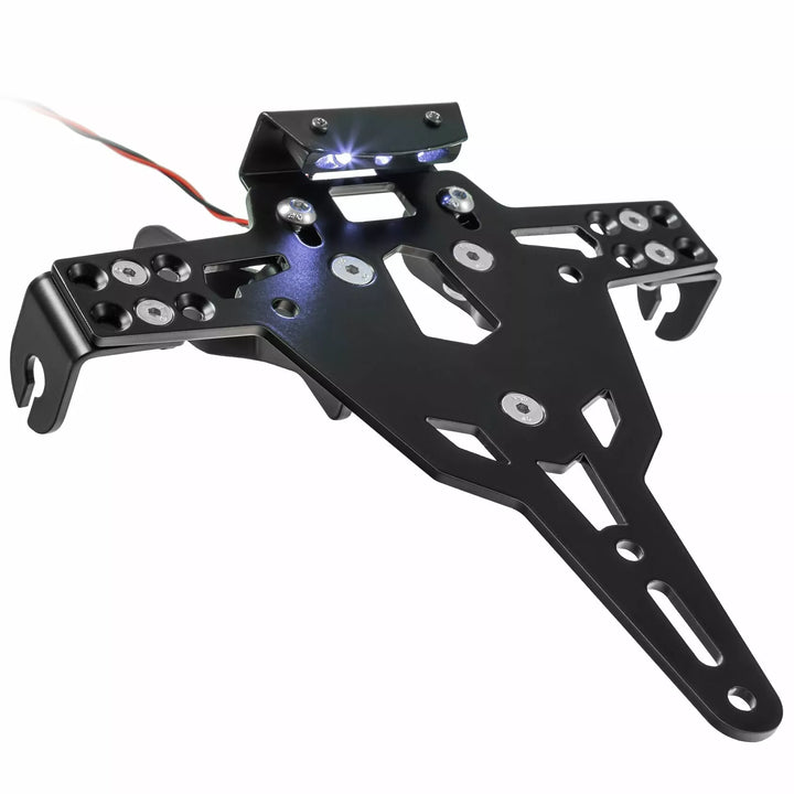 The License Plate Holder is Extremely Durable and Weather Proof., Black Powder Coated. , The License Plate Holder Can Be Used For Any Kind of License Plate (175mm Width)., No Modification of Fairing Required., Stepless Adjustment of Rake Angle., Indicator Support Adjustable in 3 Positions. Plate., Special Indicator Light Mounts (Sold Separately) Required for Stock Indicator Lights., Kit Includes: 1 License Plate Holder Incl. Mounting Kit., LED License Plate Light "E Approsved" Incl. Support., Back Light With Support. Of: Germany, Slovenia, Croatia & UK.