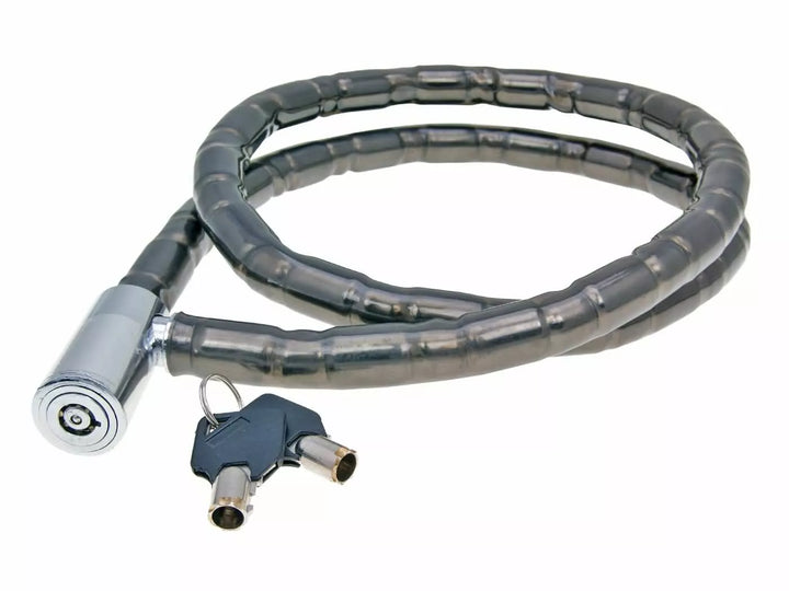 Meget robust pansret kædelås med fleksibel gummibelægning. , Længde 1,20 m / diameter ca. 18 mm. , Klassikeren blandt tohjulslåse., Leveres med 2 taster.
