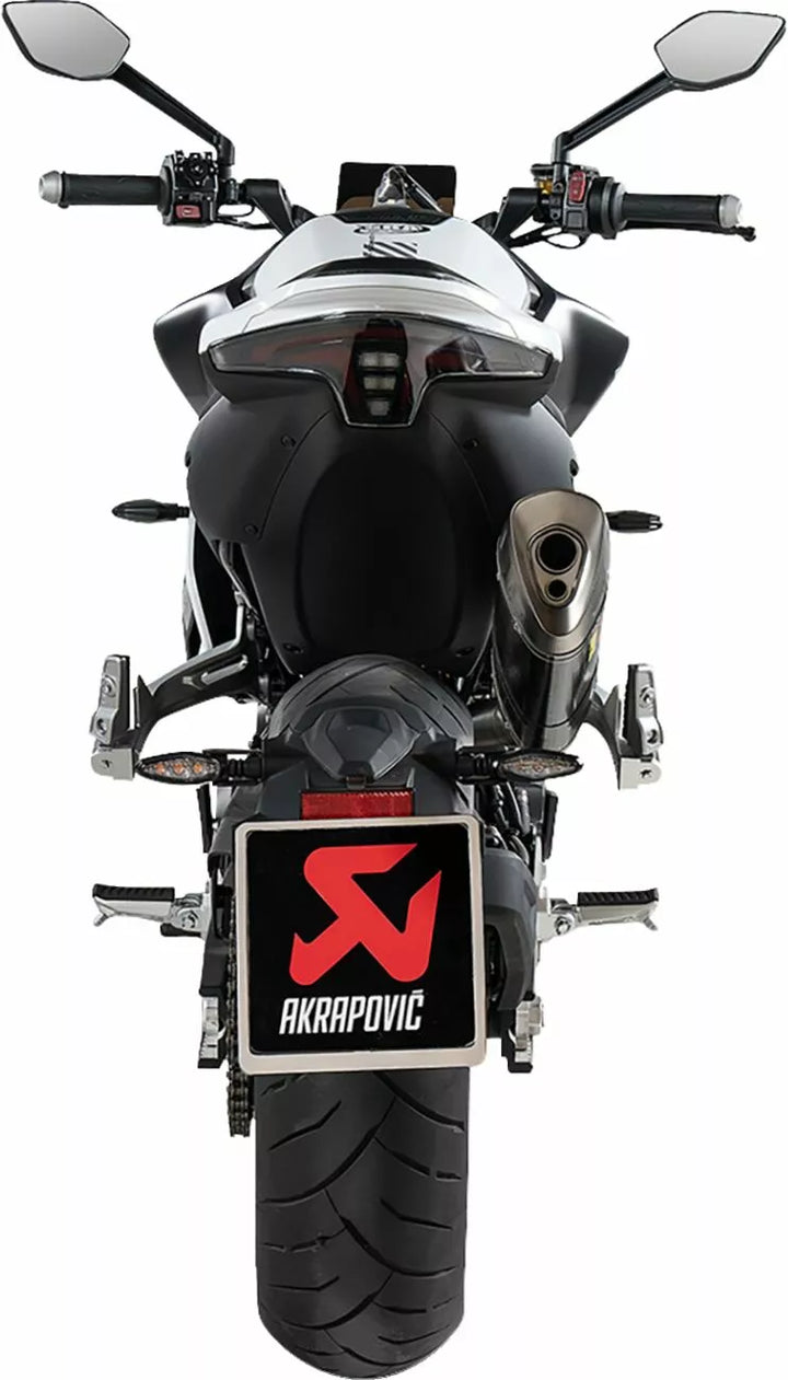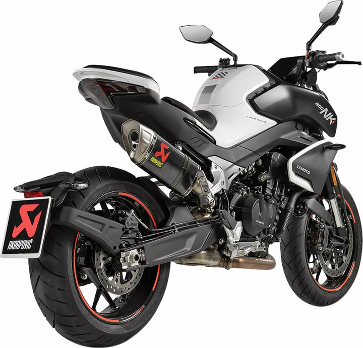 Compact Racing-Inspired Look That Seamlesly Integrates With The Bike メ S Lines and Color Scheme, Constructed From Race Sample Materials, Including A Carbon-Fiber Muffler Sleeve and Muffler Clamp, a Titanium End Cap, and a stain Link kg) Compared to the standard stock system and produces a deep sporty tone that highlights the 799 cc twin cylinder engine, Focused on Throttle Response and Rideability, Delivers Performance Gevinster, især i midten og øverste omdrejningstal, med kraften på 1.3k 4.900 o / min, som testet på Akrapovic メ s intern dyno, og sammenlignet med en CF Moto 800 NK udstyret med et standard lagerudstødningssystem, kan let installeres uden genindlæsning