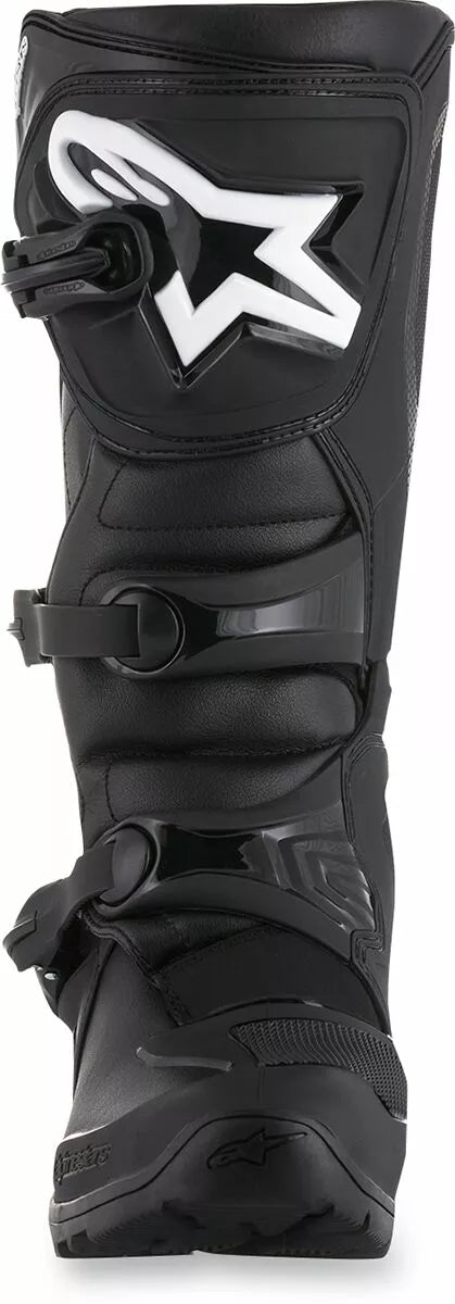 Boot øvre konstruktion er et innovativt, let mikrofibermateriale, der er fleksibelt og slidbestandigt, let mikrofiber på for- og bag bellows giver et mere behageligt flexområde, tåboksen er lavet af syntetisk materiale til høj slidbestandighed hjælper med at forsegle vand og snavs, kontureret termoplastisk polyurethan (TPU) kalvevagt, TPU højere medial vagt, tpu outer lateral ankle beskytter og TPU For påvirkninger er bagerste TPU Gaiter Patch Appl Impact Resistance på det bageste flexområde, injiceret TPU-shinplade forbundet med TPU-medialt beskyttelsespanel, kroge-og-loop-øvre bagagerum med TR-klap, der giver en bred vifte af pasform og støtte, TPU højere medial Protation Design Biomechanical Medial System Pak ind glat fra den forreste flex og medial beskyttelse til sidesiden af bagagerummets flexibili-polymerspænder med ratchet-lukning, spændehukommelsessystem og hurtig frigørelse/låsesystem med et selvudviklingsdesign, alle bagagerum er udskiftelig, ét stykke tpu indsprøjtet dobbeltbuksefod er forstærket med at omgive anderne og bagager Udskiftelig EVA-fodseng med tekstil topforing, Alpinestars All-Terrain Sole Design med høje høje gummiforbindelser; Sål kan udskiftes