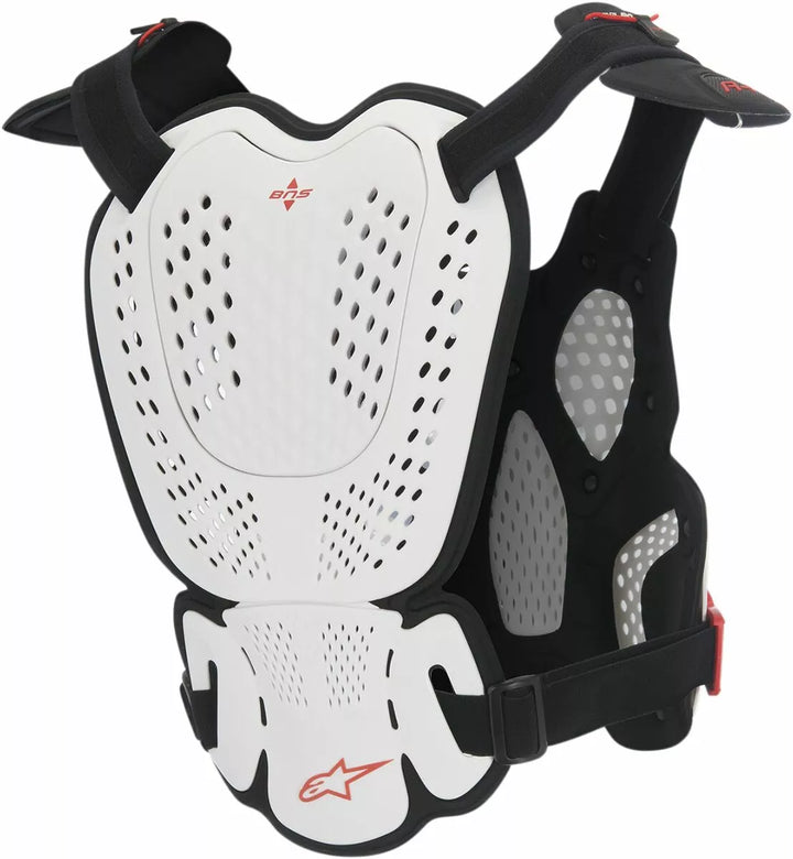 EN 14021: 2003, Stone Shield og Back Protectors er konstrueret ud fra en højtydende poly-materialemateriel blanding for optimeret fleksibilitet og fremragende vægtbesparelse, beskytter spastiske skaller er perforeret til maksimal åndbarhed og afkøling af gyldigt let at bruge spænder, der passer til en bred række rider kropstyper, termoformeret polstret chassis til optimerede niveauer af komfort og tæt-til-den-krop BNS-halsstastler Hals BAC-faner for let og sikkert engagement i BNS, aftagelige og justerbare skulderpuder til størrelse regulering med integreret BNS-siliciumtrækfane, innovativt integreret Y-strap-system til modulær brug af rygbeskytter med hurtig og praktisk montering, rygbeskyttelse