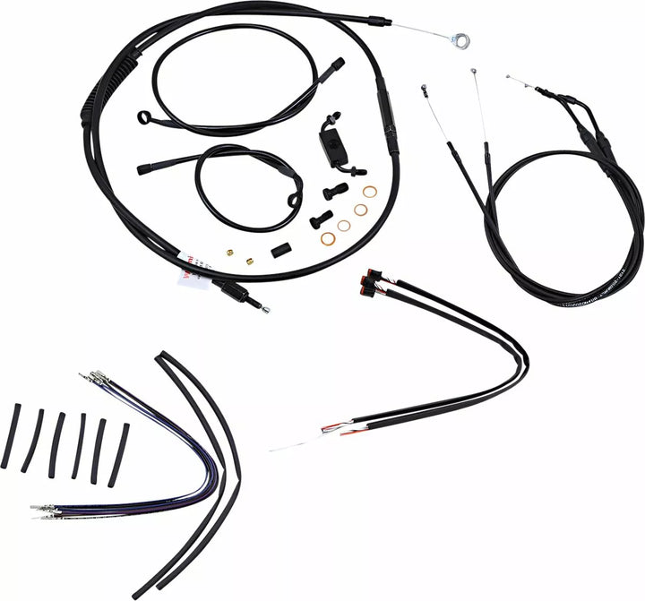 Komplet installationssæt til burly abe-bøjler, sæt inkluderer udvidet bremselinie (medmindre det er angivet), udvidet koblingskabel/koblingslinje, udvidet gashåndtering/tomgang kabler som krævet og alle nødvendige ledninger, bremsens indre linjer, whhen inkluderet, felemudd, ydre fletning, dressur kits genanvendelse af lager throttle-by-wire-haven, kit er baseret på at bruge 2 "Risers med APE HRE HANGER-TYSE HADEBARS.