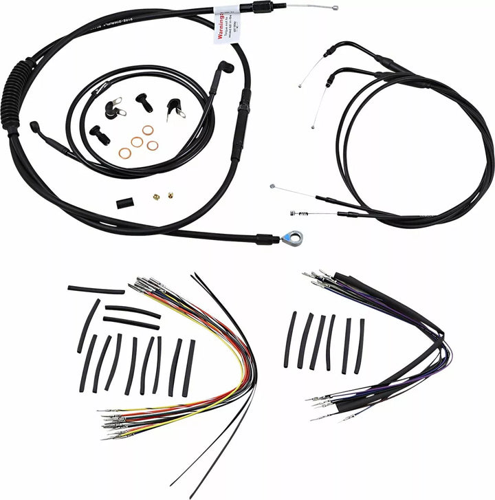 Komplet installationssæt til burly abe-bøjler, sæt inkluderer udvidet bremselinie (medmindre det er angivet), udvidet koblingskabel/koblingslinje, udvidet gashåndtering/tomgang kabler som krævet og alle nødvendige ledninger, bremsens indre linjer, whhen inkluderet, felemudd, ydre fletning, dressur kits genanvendelse af lager throttle-by-wire-haven, kit er baseret på at bruge 2 "Risers med APE HRE HANGER-TYSE HADEBARS.