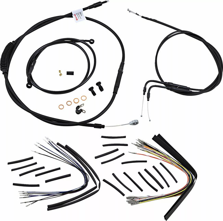 Komplet installationssæt til burly abe-bøjler, sæt inkluderer udvidet bremselinie (medmindre det er angivet), udvidet koblingskabel/koblingslinje, udvidet gashåndtering/tomgang kabler som krævet og alle nødvendige ledninger, bremsens indre linjer, whhen inkluderet, felemudd, ydre fletning, dressur kits genanvendelse af lager throttle-by-wire-haven, kit er baseret på at bruge 2 "Risers med APE HRE HANGER-TYSE HADEBARS.