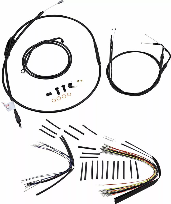 Komplet installationssæt til burly abe-bøjler, sæt inkluderer udvidet bremselinie (medmindre det er angivet), udvidet koblingskabel/koblingslinje, udvidet gashåndtering/tomgang kabler som krævet og alle nødvendige ledninger, bremsens indre linjer, whhen inkluderet, felemudd, ydre fletning, dressur kits genanvendelse af lager throttle-by-wire-haven, kit er baseret på at bruge 2 "Risers med APE HRE HANGER-TYSE HADEBARS.