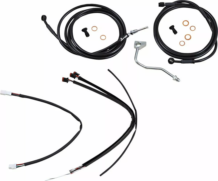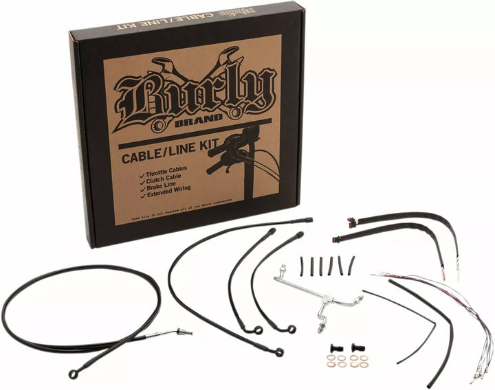 Komplet installationssæt til burly abe-bøjler, sæt inkluderer udvidet bremselinie (medmindre det er angivet), udvidet koblingskabel/koblingslinje, udvidet gashåndtering/tomgang kabler som krævet og alle nødvendige ledninger, bremsens indre linjer, whhen inkluderet, felemudd, ydre fletning, dressur kits genanvendelse af lager throttle-by-wire-haven, kit er baseret på at bruge 2 "Risers med APE HRE HANGER-TYSE HADEBARS.