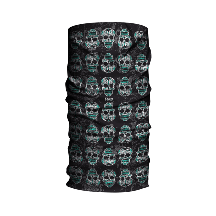 BÜSE Halskrage Tuch Mexican med svart bakgrund och mönster av mexikanska dödskallar i grönt och vitt. Perfekt som stilfull halskrage för motorcyklister.