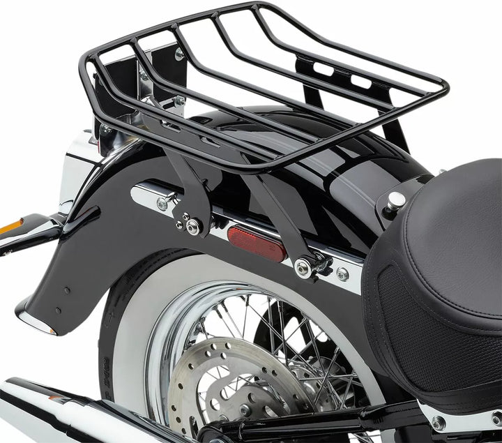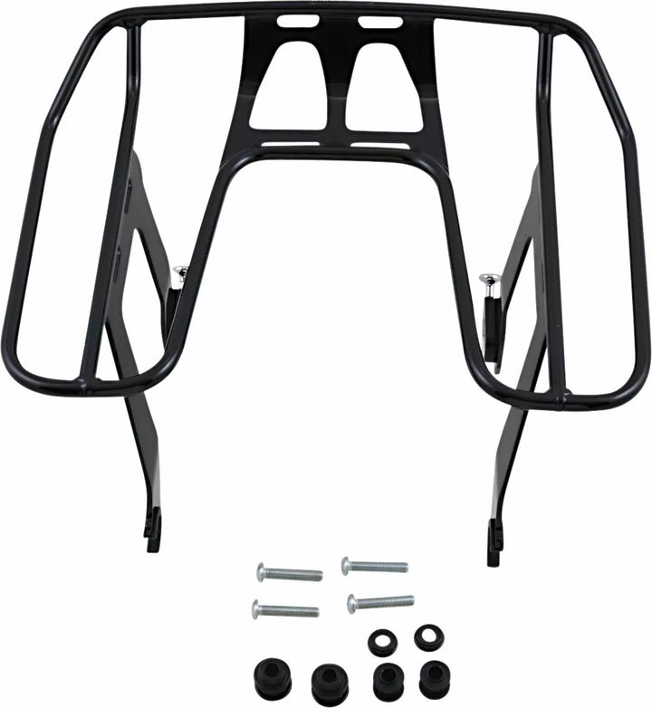 Øverst på racket handler om niveau med toppen af sædet, og hvert rack har et spark op bagpå, der er steder at fastgøre bungee -ledninger eller montering af stropper, så du ikke længere skal ridse din cykelhen S Fender, når du fastgør din last, monteringshardware alta. Harley-Davidson monteringskit. Hvis eftermarkedssædet ikke er saddlemere eller Lucky Daves træder op, skal du se karenly på målingerne af åbningen for at sikre, at racket passer rundt på dit cykels sæde.