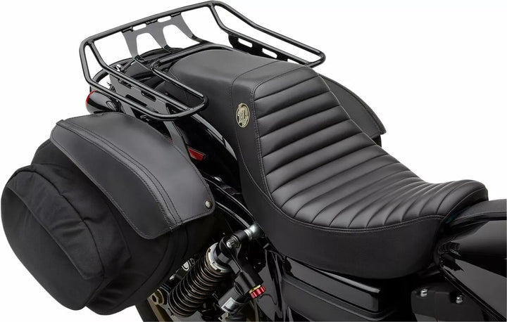 Øverst på racket handler om niveau med toppen af sædet, og hvert rack har et spark op bagpå, der er steder at fastgøre bungee -ledninger eller montering af stropper, så du ikke længere skal ridse din cykelhen S Fender, når du fastgør din last, monteringshardware alta. Harley-Davidson monteringskit. Hvis eftermarkedssædet ikke er saddlemere eller Lucky Daves træder op, skal du se karenly på målingerne af åbningen for at sikre, at racket passer rundt på dit cykels sæde.