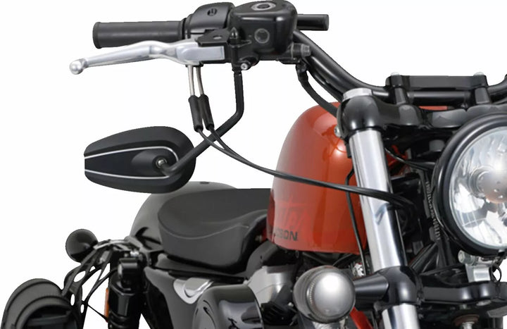 E-markeret, materielt spejlhoved: Aluminium med CNC-overflade, adapter M10 x P1.25 (R/H-tråd) og Harley inkluderet, materiel spejlarm: stål/aluminium, CNC aluminiumskrop