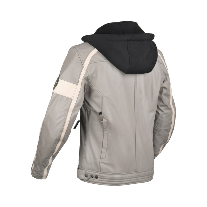 Baksidan av Difi Mc-Skinnjacka Detroit 2 Grå med svart avtagbar huva och vita kontrastlinjer. Robust design för motorcyklister.