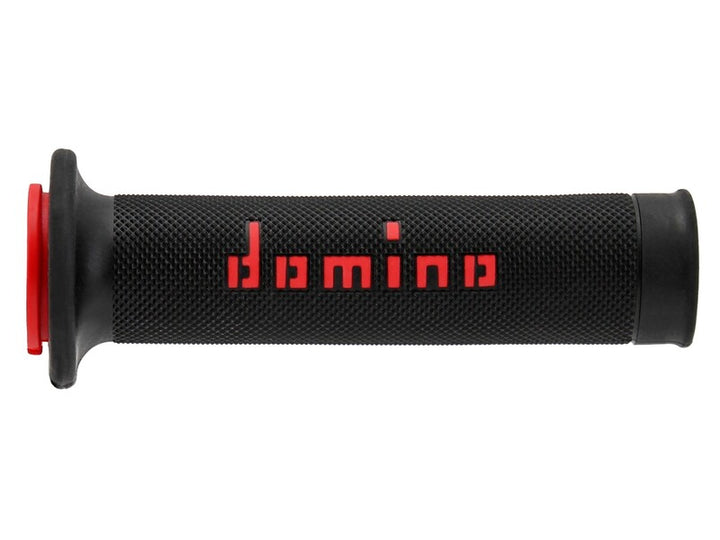 Domino -greb kombinerer teknisk dygtighed og design for optimal rytter komfort. Vej/racing-greb optimerer følelse på styret lavet af TPE leveret af par ende åben farve: sort & rød greb_compound: dobbelt sammensætning greb_type: ingen vaffel lock-on: ikke