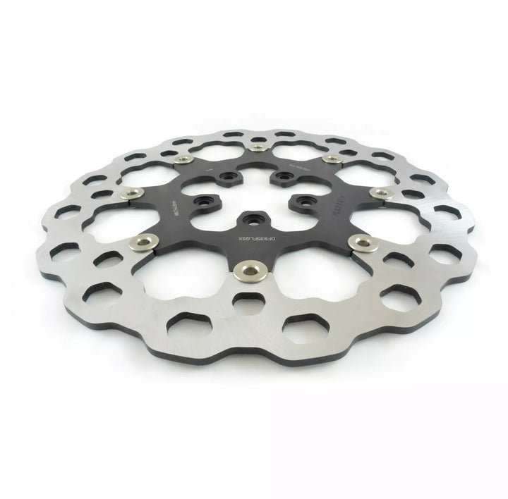 Anodiseret eller forkromet højresistensrustfrit stål (AISI 420) bærer, vægttab på grund af unikke bremseoverfladehuller, lavere vægt af de uprintmasser., Mere bremsekraft, bedre varmeafledning. Kontakt Surface Pad-Disc, forbedre og personalisere motorcykelestetikken