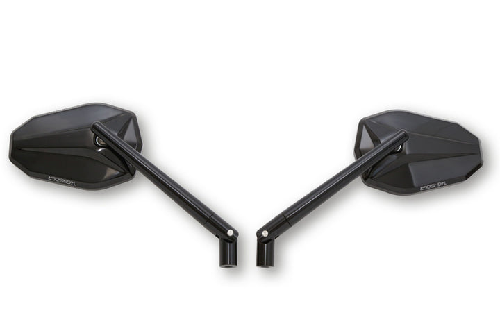 Stilrene kapspejle i sorteloxeret aluminium fra Highsider – perfekte for dig som ønsker at kombinere elegant design med funktionel sikkerhed. Victory-modellen har et justerbart og drejeligt beslag med et ekstra led for endnu bedre tilpasning til din kørestilling. Spejlene er E-godkendte og passer til både retro- og moderne MC-stilarter.