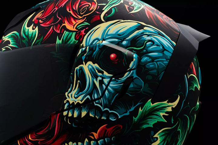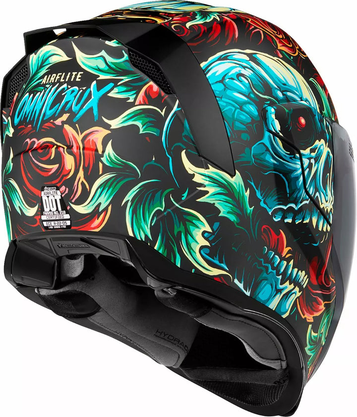Injektionsstøbt polycarbonatskal til styrke, fagfri Dropshield ™ med udvendig switch, quick-skift tågefrit fliteshield ™ med sideplader, aftagelig støbt åndedrætsafbøjning og hakegardinvejledningskølesystem, interne højttalerpockets arbejde med ICONs R.A.U. Bluetooth -enhed, Dropshield ™ -visiret må kun bruges, mens hovedfladet er i den fuldt lukkede position, aftagelig Hydradry ™ fugtighedsvejrforing, inkluderer Clear & Dark Smoke Fliteshield ™