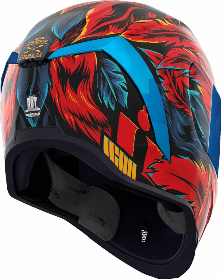 Injektionsstøbt polycarbonatskal til styrke, intern luftstrømgeometri, kontinuerligt udluftningssystem, sculpeed halsrulle, fagfrit ikonoptik ™ skjold med Rapid-Reale ™ -system, ProCk ™ Positive Shield ™ Skrivningssystem, INTERN DROP High Visor skal kun bruges, mens hovedfladen er i den fuldt lukkede position, fjernelse af MITLEFT DEFLEKTOR, FREADABLEAGLE HYDRADRY ™ Fugtvejr foring, interne højttalerlommer fungerer med Icon's R.A.U. Bluetooth-enhed, inkluderer Clear & Rst Blue Fag-Free Optics ™ Shield