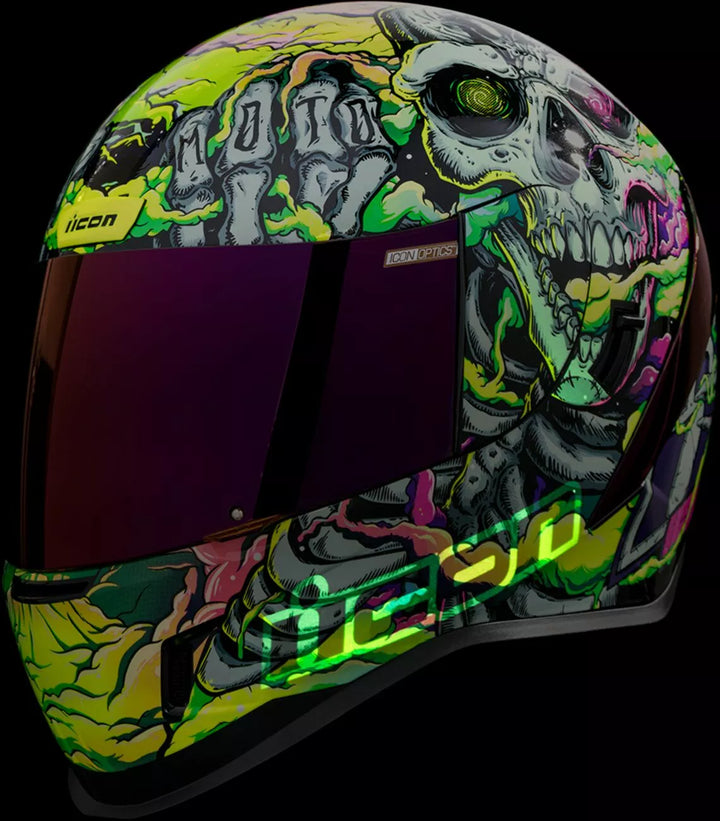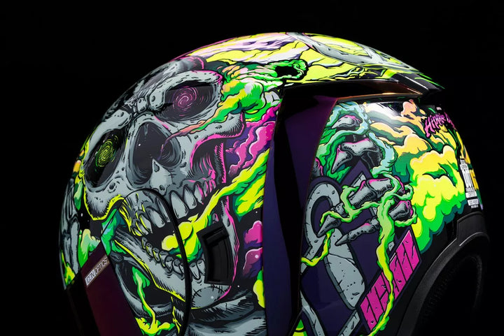 Injektionsstøbt polycarbonatskal til styrke og holdbarhed, mellemliggende hovedform, klar tågefri optik ™ skjold installeret, lilla RST FAG-fri optik ™ skjold inkluderet, mørk røglåsningssystem, Phelok Shid ™ Fjernbart komfortforing, lilla rst spoiler kit, glød i det mørke grafik, internt luftflow geometri, kontinuerlig udluftningssystem, sculpting-halsrulle, glød i det mørke grafik, internt luftflow geometri, kontinuerlig udluftningssystem, sculpting-hals, glød i det mørke grafik, internt luftflow geometri, kontinuerlig udluftningssystem, sculpting system Fagfri Icon Optics ™ Shield er med hurtig-frigør den fuldt lukkede position, aftagelig støbt åndedrætsafbøjning, intern højttalerlomme's arbejde med Icon's R.A.U. Bluetooth -enhed