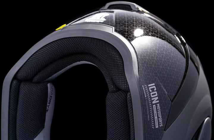 Injektionsstøbt polycarbonatskal til styrke, Prolock ™ Positive Shield Locking System, kontinuerligt udluftningssystem, fagfrit ikonoptik ™ skjold med Rapid-Reale ™ -system, skulpturelt halsrulle, intern luftstrømgeometri, den indre drop hield visor skal kun bruges, mens hovedfladen er i den fuldstændigt lukkede position, fjernelse af den fjernede leeder, der defler, fjernelse af rysten Hydry ™ Fugtvejr foring, interne højttalerlommer fungerer med Icon's R.A.U. Bluetooth -enhed, inkluderer Clear & Dark Smoke Icon Optics ™ Shield, Inkluderer Dark Smoke Dropshield ™, inkluderer Black Airform Chin Vent ™