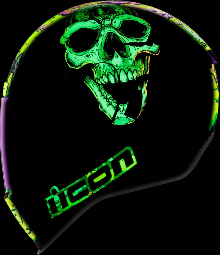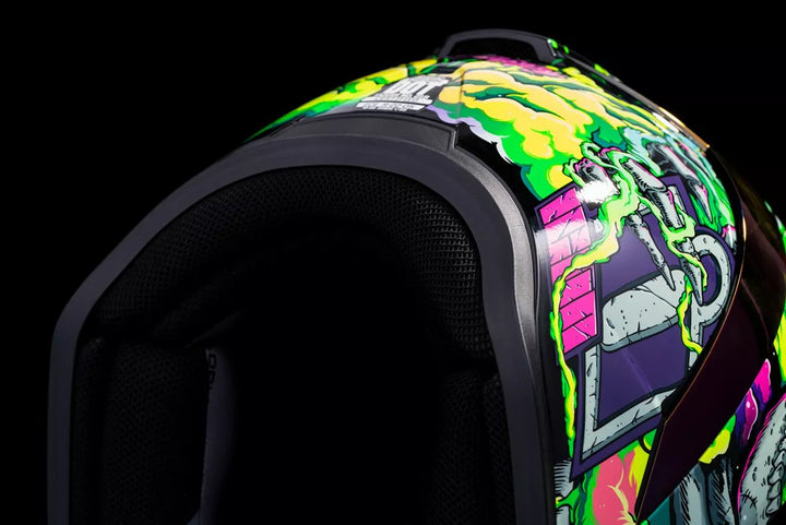Injektionsstøbt polycarbonatskal til styrke og holdbarhed, mellemliggende hovedform, klar tågefri optik ™ skjold installeret, lilla RST FAG-fri optik ™ skjold inkluderet, mørk røglåsningssystem, Phelok Shid ™ Fjernbart komfortforing, lilla rst spoiler kit, glød i det mørke grafik, internt luftflow geometri, kontinuerlig udluftningssystem, sculpting-halsrulle, glød i det mørke grafik, internt luftflow geometri, kontinuerlig udluftningssystem, sculpting-hals, glød i det mørke grafik, internt luftflow geometri, kontinuerlig udluftningssystem, sculpting system Fagfri Icon Optics ™ Shield er med hurtig-frigør den fuldt lukkede position, aftagelig støbt åndedrætsafbøjning, intern højttalerlomme's arbejde med Icon's R.A.U. Bluetooth -enhed
