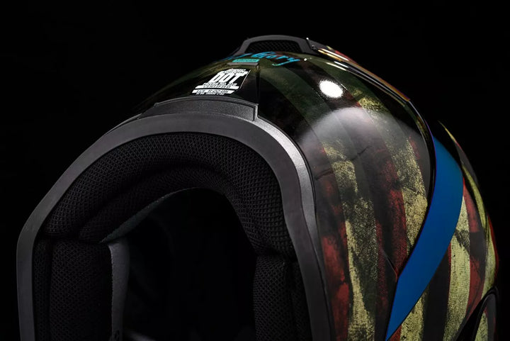 Injektionsstøbt polycarbonatskal til styrke, intern luftstrømgeometri, kontinuerligt udluftningssystem, sculpeed halsrulle, fagfrit ikonoptik ™ skjold med Rapid-Reale ™ -system, ProCk ™ Positive Shield ™ Skrivningssystem, INTERN DROP High Visor skal kun bruges, mens hovedfladen er i den fuldt lukkede position, fjernelse af MITLEFT DEFLEKTOR, FREADABLEAGLE HYDRADRY ™ Fugtvejr foring, interne højttalerlommer fungerer med Icon's R.A.U. Bluetooth -enhed, glød i mørke, inkluderer klar og første Blue Optics ™ Shields, inkluderer Dark Smoke Dropshield ™