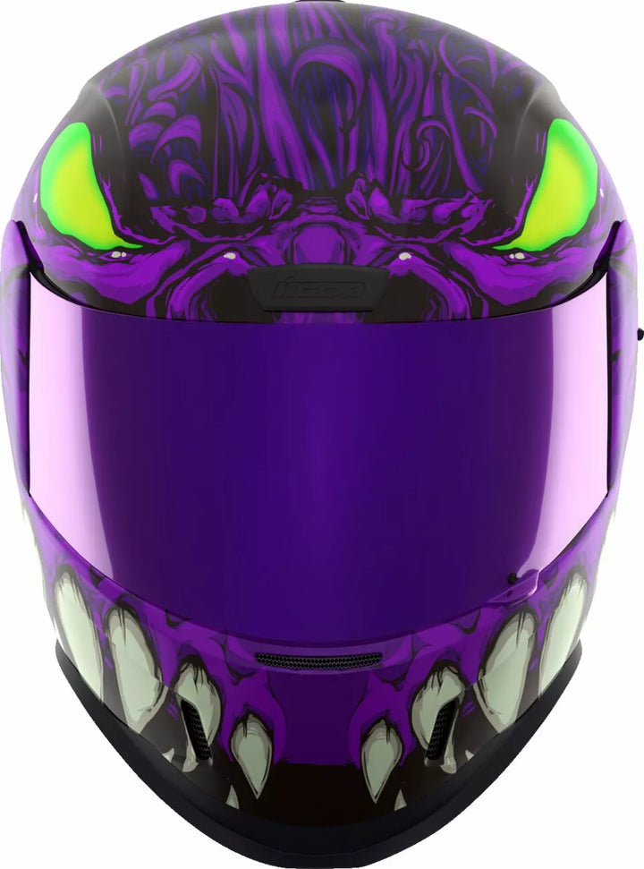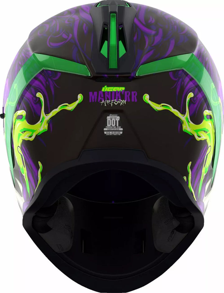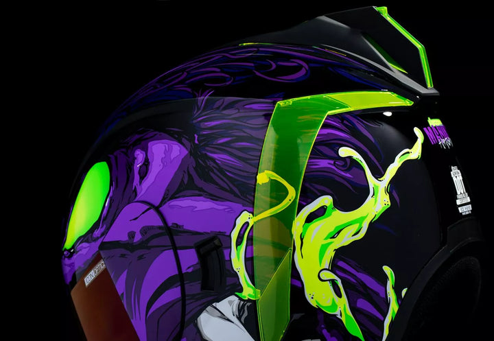 Kontinuerligt udluftningssystem, fagfrit ikonoptik ™ skjold med Rapid-Release ™ -system, injektionsstøbt polycarbonatskal til styrke, intern luftstrømgeometri, skulptureret halsrulle, Prolock ™ Switch, den udvendige med låseskivende swequ Visor, skal kun bruges, mens hovedfladen er i den fuldt lukkede position, fjernet støbt pustet med locking, fjernelse. 3-delt fugtvæberforing, interne højttalerlommer fungerer med Icon's R.A.U. Bluetooth -enhed, inkluderer Dark Smoke Dropshield ™ og Rubatone Black Speedfin ™