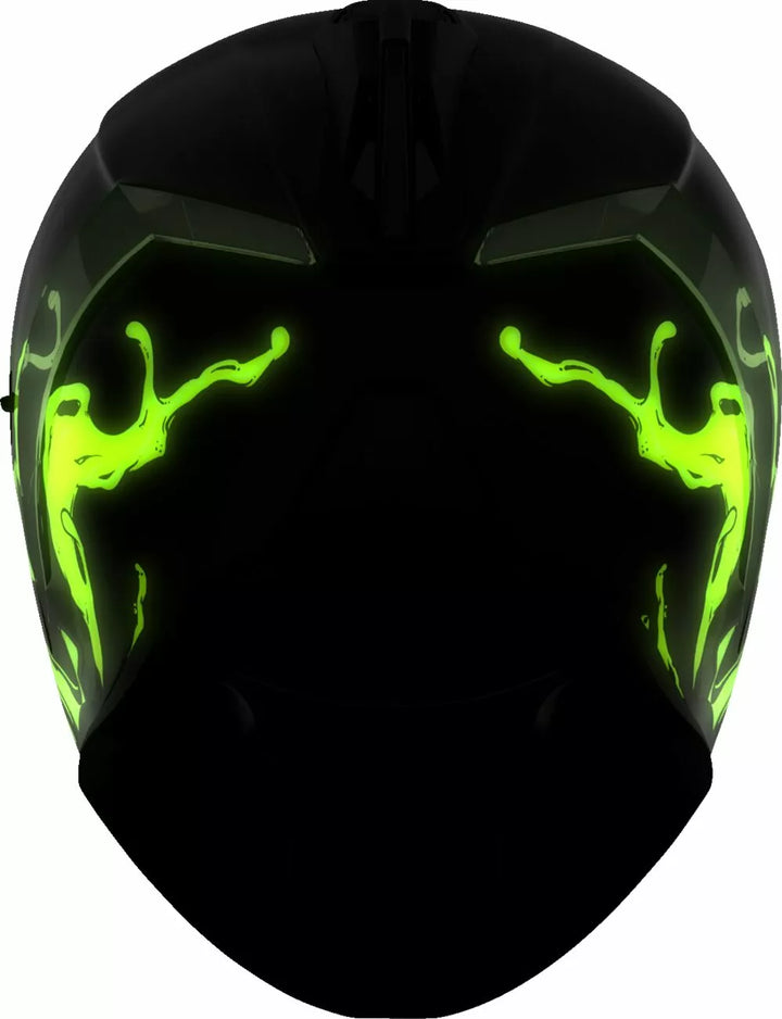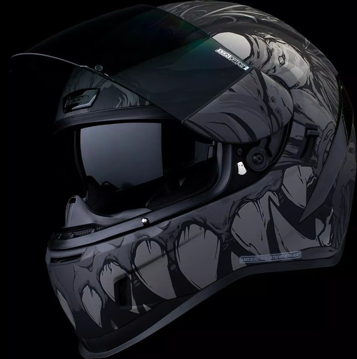Kontinuerligt udluftningssystem, fagfrit ikonoptik ™ skjold med Rapid-Release ™ -system, injektionsstøbt polycarbonatskal til styrke, intern luftstrømgeometri, skulptureret halsrulle, Prolock ™ Switch, den udvendige med låseskivende swequ Visor, skal kun bruges, mens hovedfladen er i den fuldt lukkede position, fjernelse af den fjernede pusten, fjernelse af Living. 3-delt fugtvæberforing, interne højttalerlommer fungerer med Icon's R.A.U. Bluetooth -enhed, inkluderer Dark Smoke Dropshield ™ og Rubatone Black Speedfin ™
