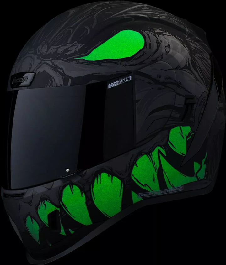 Kontinuerligt udluftningssystem, fagfrit ikonoptik ™ skjold med Rapid-Release ™ -system, injektionsstøbt polycarbonatskal til styrke, intern luftstrømgeometri, skulptureret halsrulle, Prolock ™ Switch, den udvendige med låseskivende swequ Visor, skal kun bruges, mens hovedfladen er i den fuldt lukkede position, fjernelse af den fjernede pusten, fjernelse af Living. 3-delt fugtvæberforing, interne højttalerlommer fungerer med Icon's R.A.U. Bluetooth -enhed, inkluderer Dark Smoke Dropshield ™ og Rubatone Black Speedfin ™